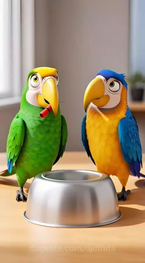 Dois papagaios acendem uma bombinha debaixo de uma tigela; a tigela cai cobrindo @djdtoficial