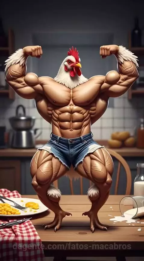 Um frango sem penas com corpo musculoso de fisiculturista humano dançando em cima @djdtoficial